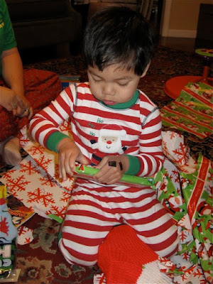 Very impressive, Santa! Reed looks so darned cute in those striped Santa pj's! Looks like he had an awesome morning opening all those gifts. And I am impressed that you have already blogged!! I also cracked up about the measuring spoons. Smart move to get free shipping!